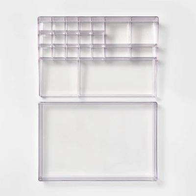 Keep your countertops or cabinets neat and tidy with the help of this Extra-Large Bathroom Plastic Tiered Cosmetic Organizer from Brightroom™. With a modular, stackable design and clear plastic construction, this beauty organizer helps keep a wide variety of toiletries and cosmetics contained and organized to help keep your bathroom clutter free. The top tray features 21 compartments in a range of sizes, so you can store nail polish, brushes, mascara and more while keeping everything visible and within easy reach. A single-compartment bottom tray stacks underneath for space-saving storage.